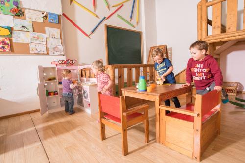 Ein langweiliger Regentag? Nicht bei uns! Im großen Spielehaus sorgen ein Kletterturm, große Maltafeln und eine Spielecke mit Höhle und Kaufladen für kunterbunte Unterhaltung. Ob kleine Piraten auf Seefahrt oder Puppenmütter, die ihr Baby in den Schlaf wiegen – hier ist genügend Platz für Kinderwelten! Beim Kicker oder Tischtennis können sich auch mit Erwachsenen fröhliche und laute Matchs geliefert werden.